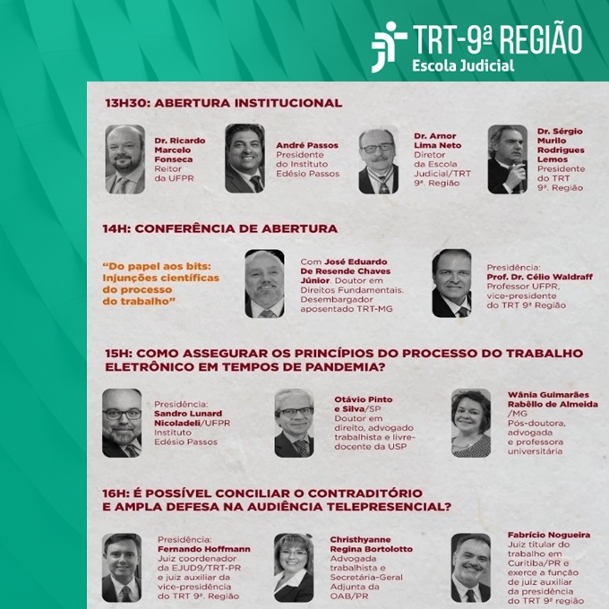 Na próxima sexta-feira (3/7) será realizado o Seminário “Pandemia e Processo do Trabalho”, promovido pela Escola Judicial do TRT do Paraná, em parceria com a Universidade Federal do Paraná – UFPR e com o Instituto Edésio Passos.