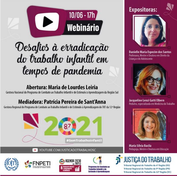 O TRT-PR promove, no próximo dia 10, o webinário "Desafios à erradicação do trabalho infantil em tempos de pandemia", em parceria com os Tribunais da 4ª e da 12ª Região. O evento é uma iniciativa dos Programas de Combate ao Trabalho Infantil e de Estímulo à Aprendizagem dos Regionais e será transmitido pelo canal do TRT12 no YouTube, a partir das 17h.