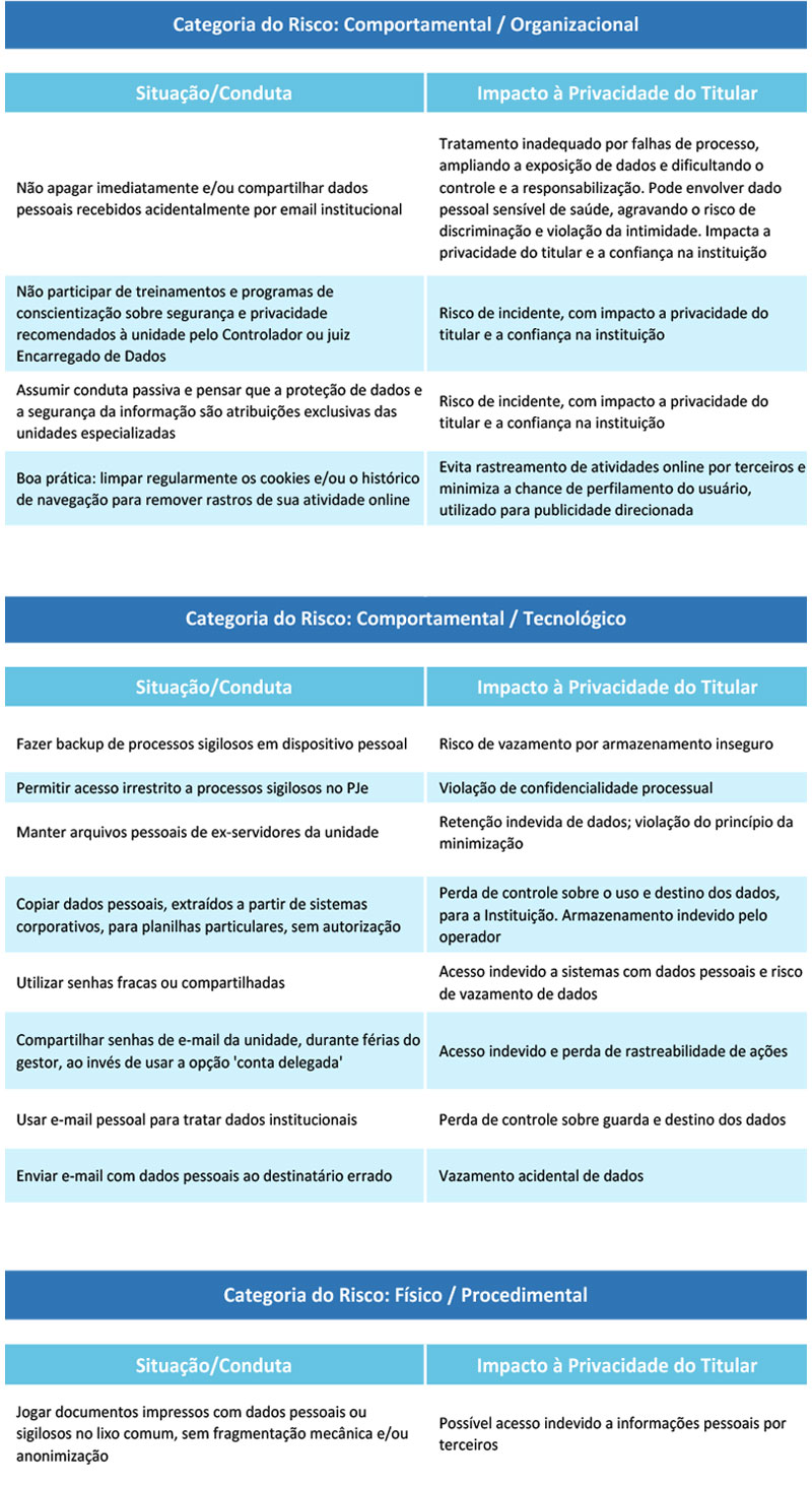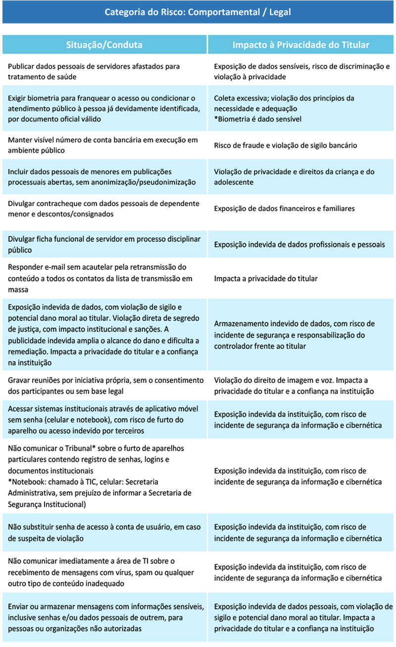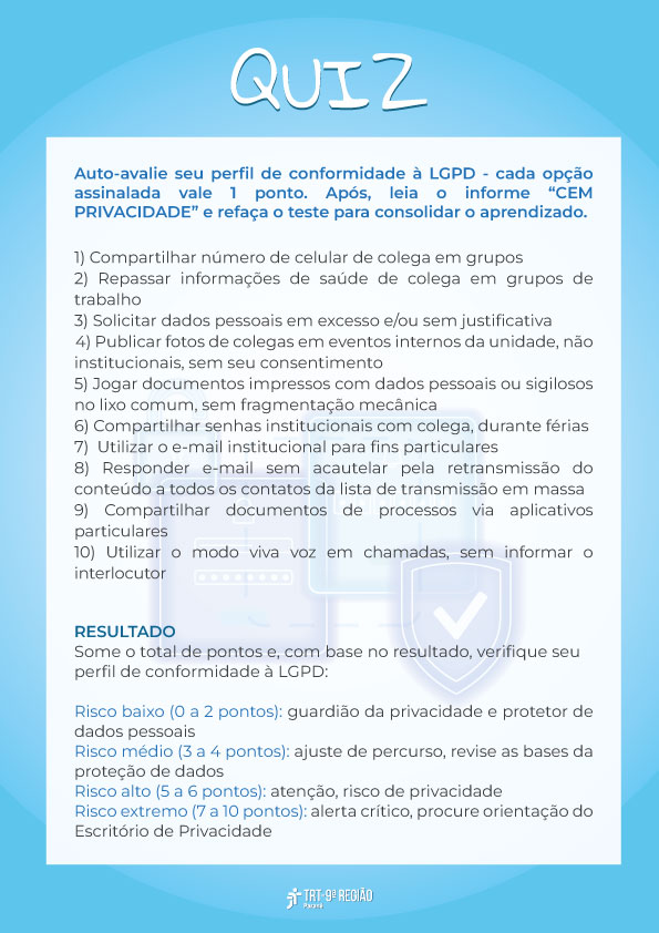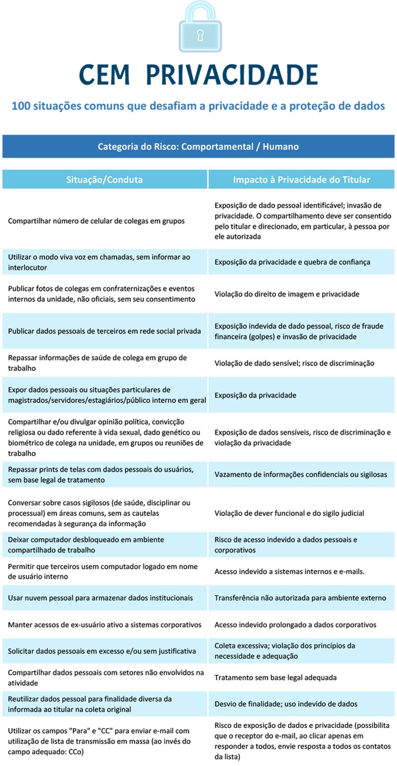 Para marcar a data, o Escritório de Privacidade do Tribunal Regional do Trabalho da 9ª Região (TRT-PR) mapeou cem comportamentos comuns, tanto no ambiente de trabalho quanto na vida pessoal, que podem expor dados e comprometer a privacidade (veja abaixo).