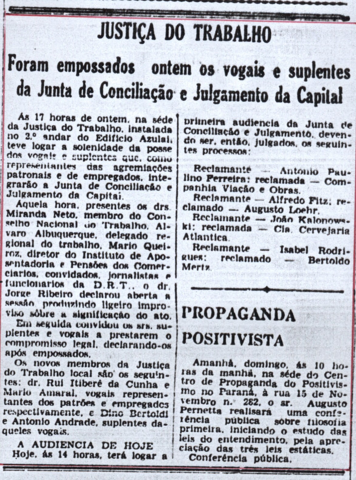 Relata que no dia anterior à publicação foram empossados os vogais e suplentes da Junta de Conciliação e Julgamento de Curitiba e que no dia 10, à tarde, seria realizada a primeira audiência.
